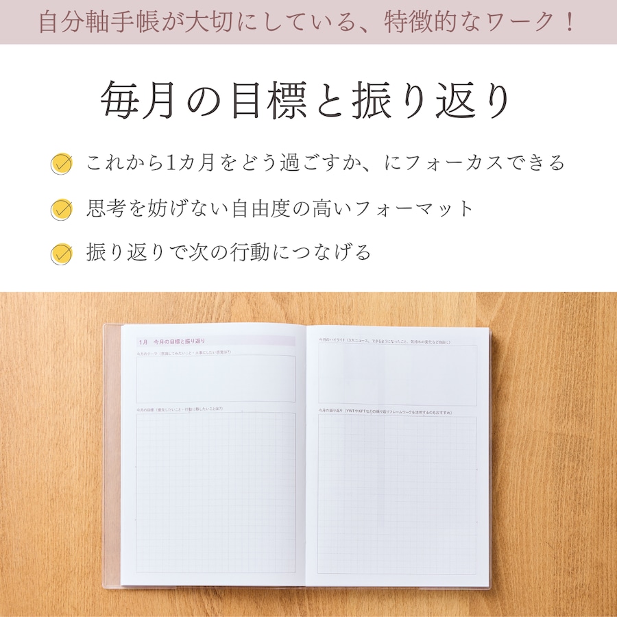 毎月の目標と振り返り。毎月このページだけは欠かさず書く人が多い自分軸手帳の要のページ。目標と振り返りのサイクルで自分軸を育てていきましょう。